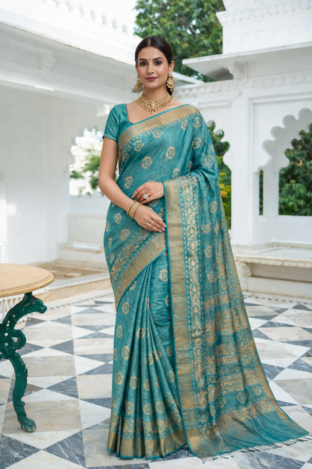 A beautiful teal batik print saree highlighted with subtle golden patterns and an elegant woven border. Its rich color and artistic print create a perfect balance of tradition and everyday elegance, making it ideal for festive and casual wear alike.